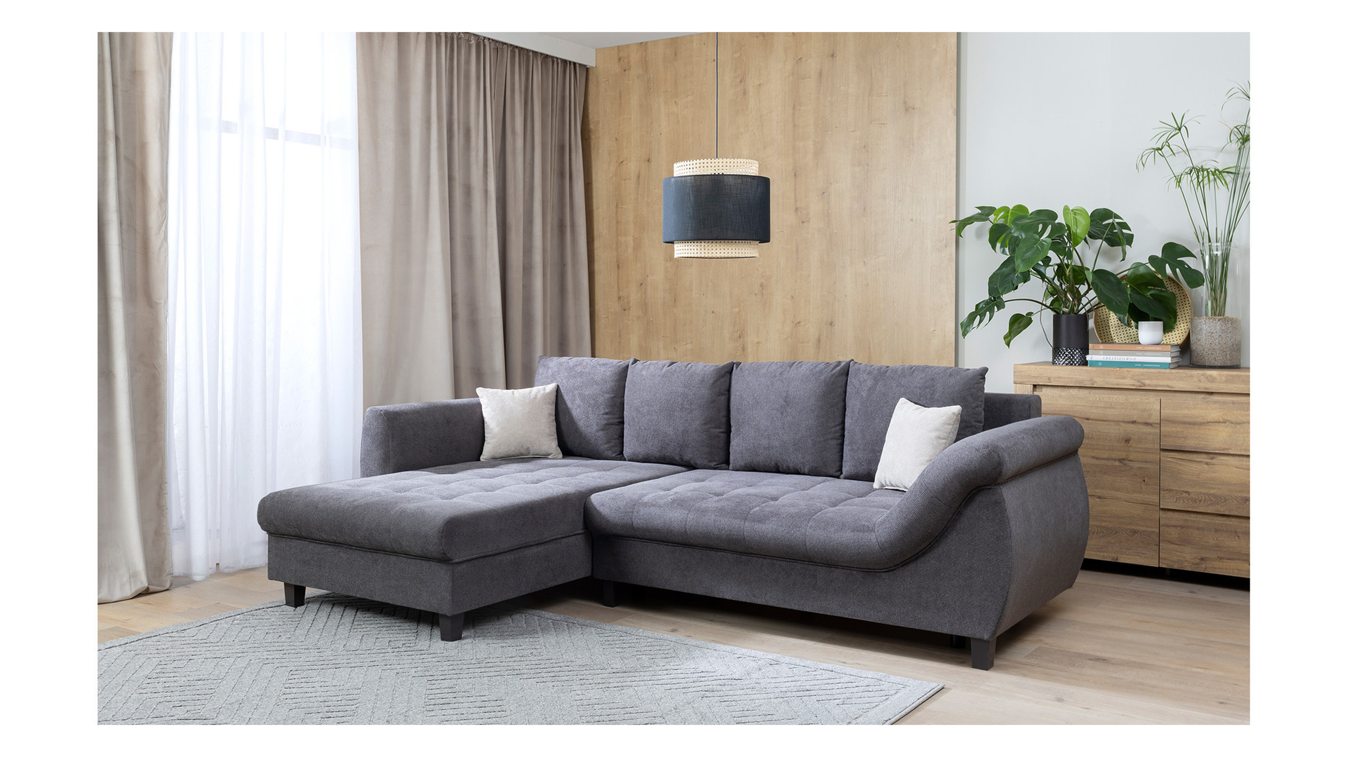 Enif oferă si posibilitatea de extindere, cu funcția automată DL – într-o singură mișcare, puteti transforma coltarul într-un pat confortabil cu dimensiunile de 135 x 200 cm. Sub șezut, veti găsi un compartiment practic pentru lenjerie de pat, in care se pot pastra pături, perne și alte accesorii, menținând astfel camera de zi ordonată. Materialul tapiteriei captivează prin textura sa subtilă și finisajul elegant. Este moale la atingere, dar rezistent la utilizarea zilnică, asigurând că acest coltar își păstrează aspectul impecabil ani de zile. Picioarele din lemn adaugă o notă de lejeritate vizuala și căldură naturală, completând perfect stilul modern al mobilierului.