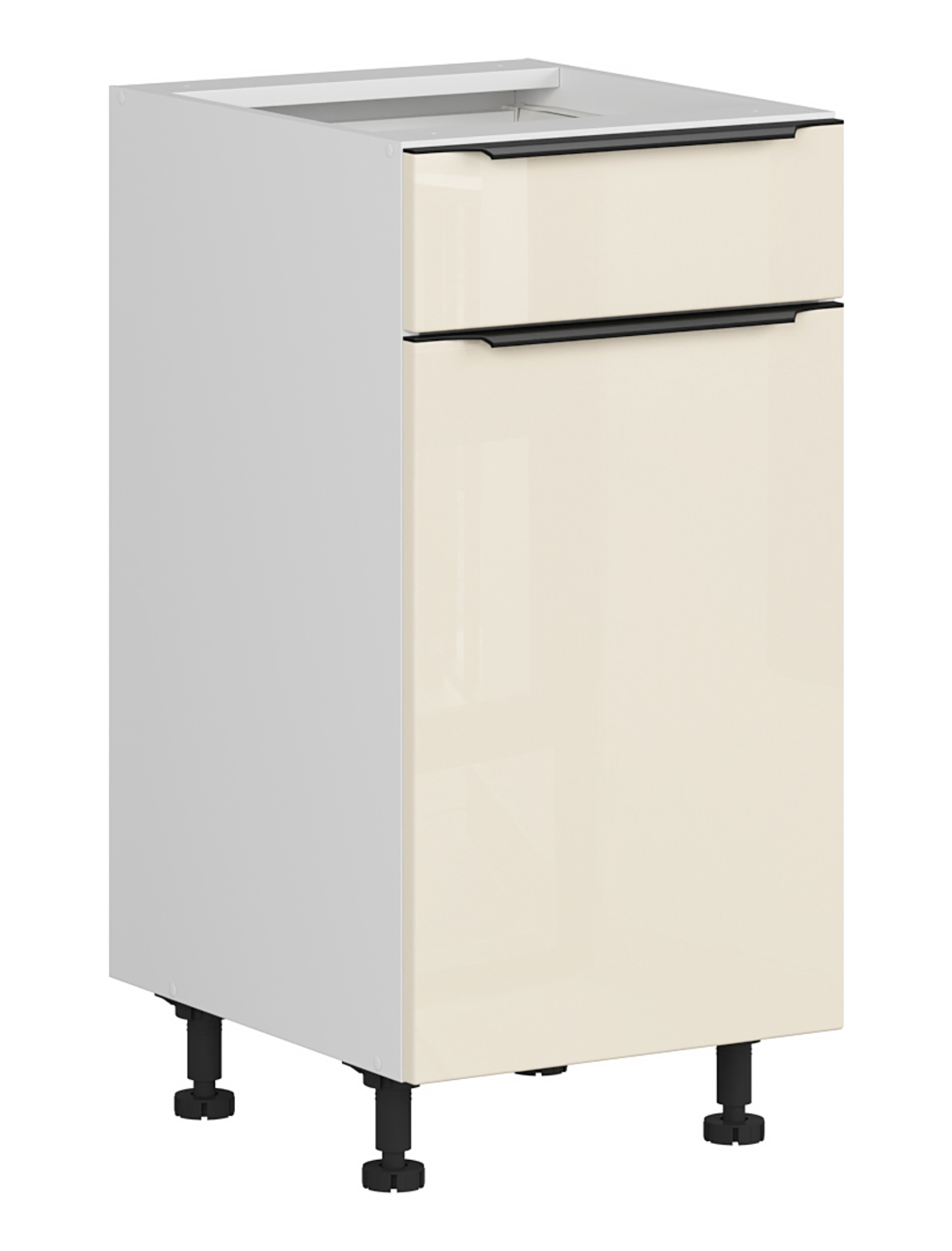 Fronturile netede de culoarea magnolie perlat sunt încadrate într-un corp alb alpin, iar întregul este completat cu mânere negre.