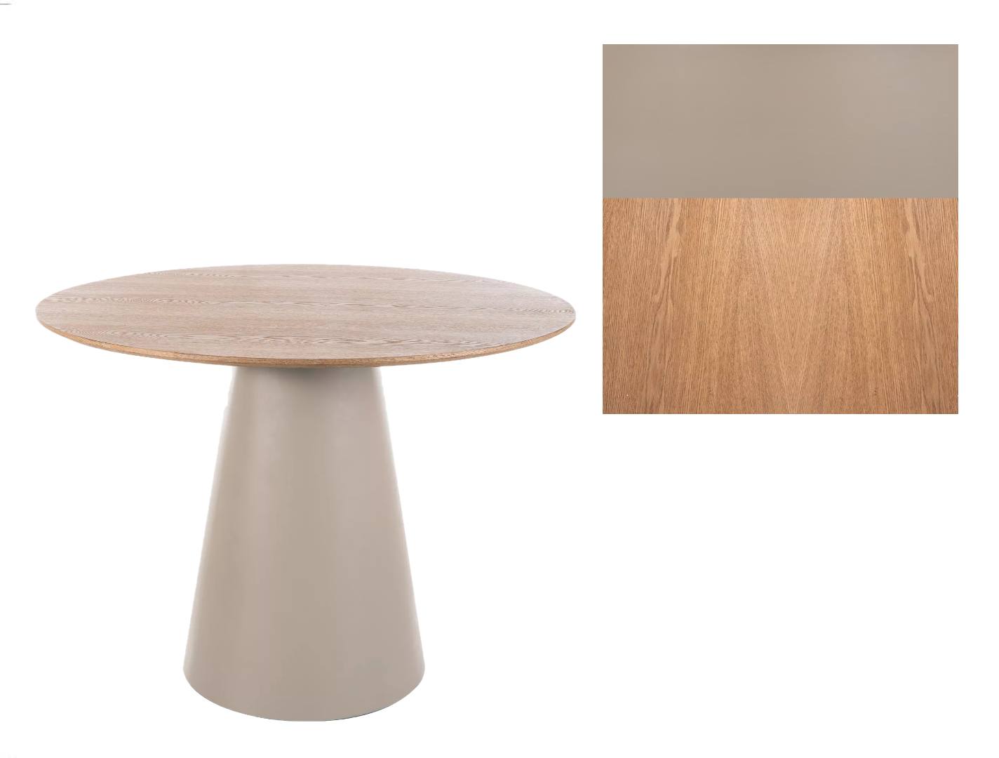Diametru 100 cm; Înălţime 75 cm; Număr de persoane – 6 locuri; Material – blat: MDF + furnir natural, cadru: MDF lăcuit; Culoare: stejar/bej kashmir mat.