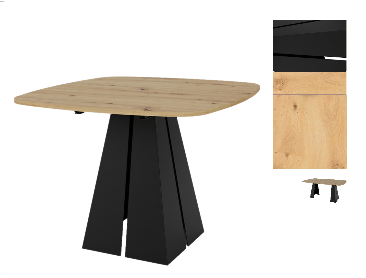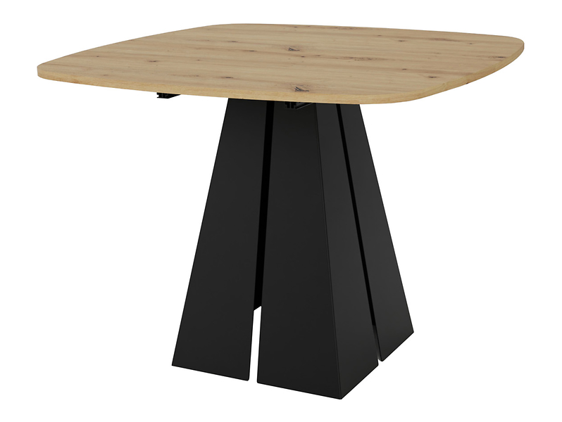 Blatul mesei din MDF de 18 mm grosime în culoarea stejarului artizan adaugă confort vizual interiorului. Cadrul negru din oțel acoperit cu vopsea pulbere este un contrast eficient cu culoarea caldă a blatului. Un picior în formă de trunchi de con nu este doar un element decorativ, ci și o garanție a stabilității. Sistemul intuitiv de desfășurare cu două inserții de cate 38 cm vă va permite să ajustați rapid dimensiunea mesei la nevoile dvs. actuale.