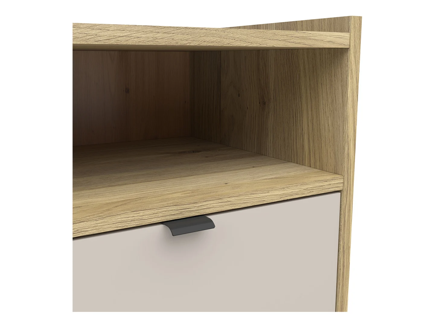 Combinația elegantă de fronturi în nuanța kashmirului cu stejarul mauvella cald creează o compoziție atemporală care vă va încânta ochii ani de zile. Mânerul subtil din aluminiu vopsit negru completează caracterul minimalist al mobilierului, asigurând în același timp confortul utilizării de zi cu zi. Noptiera Dalva face parte dintr-un sistem bine gândit. Puteți crea un aranjament complet de dormitor combinându-l cu un dulap, comodă și pat din aceeași colecție. Fiecare element a fost conceput pentru a crea un întreg coerent, emanând pace și eleganță.