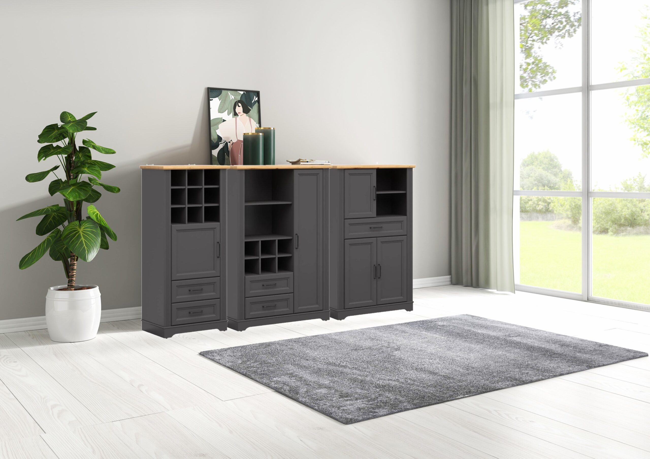 Combinația rafinată dintre o bază din grafit și un blat din stejar artizanal aduce căldură unui aranjament modern. Vitrina Tolmin combină funcționalitatea cu estetica – permițându-vă să va bucurati de obiecte frumoase în fiecare zi, menținând în același timp ordinea în cameră.